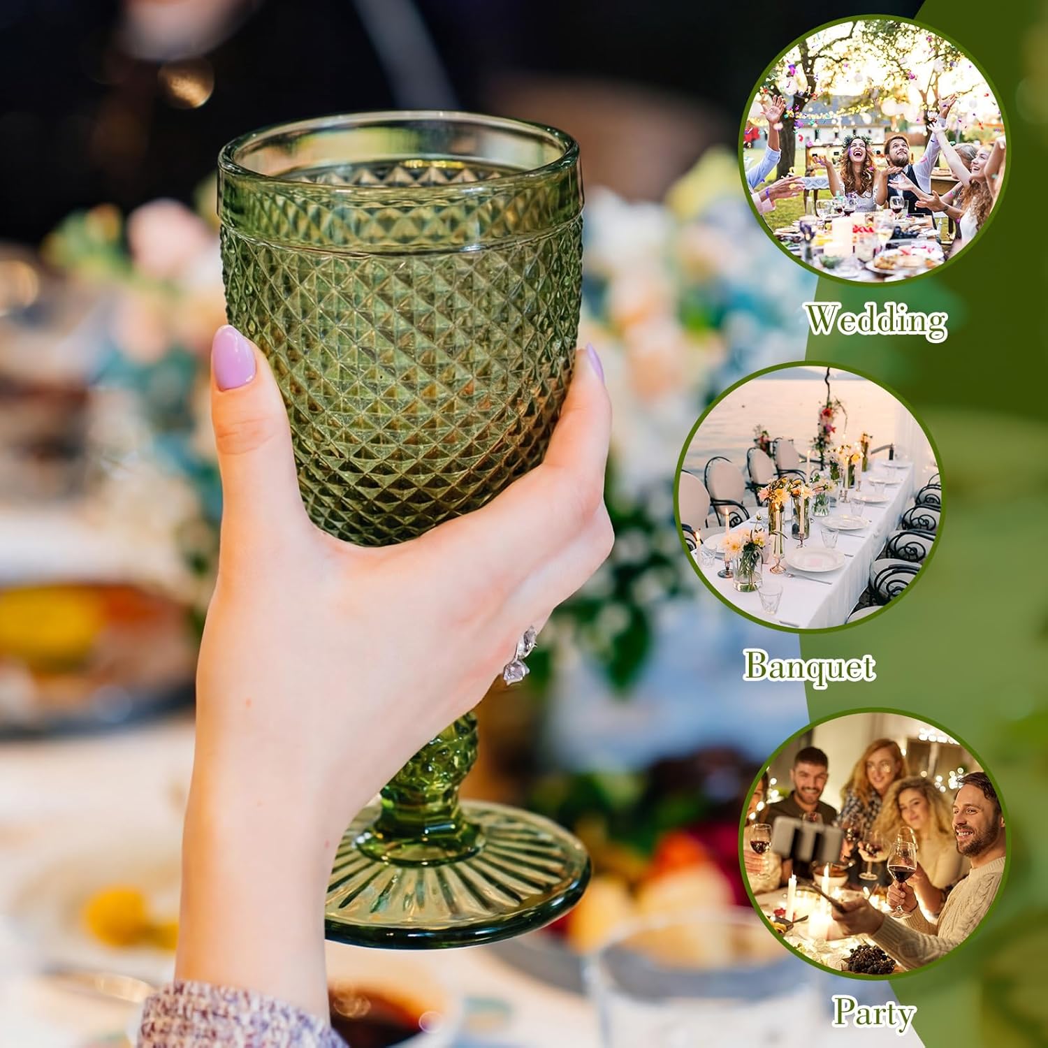 Features: Create a romantic atmosphere: The high transparent green leakproof water goblets with diamond design presents a luster after high temperature firing process, adding a more romantic atmosphere to the table, allowing you to have a romantic Valentine's Day, wedding or party. Safe material: Ideal glass material to make vintage glass stemware safe and healthy, lightweight and odorless, durable for daily use. Note: to prolong the service life, it is recommended to wash by hand, not to use the dishwasher. Creative decorations: Vintage glass with the diamond design is suitable for birthday, Christmas, anniversary, housewarming, Valentine's Day, bridal shower and other major events. The drinking glass set is not only suitable for serving events, but also proper as a creative and stylish decoration. Specifications: Material: glass Main color: green Size in capacity: approx. 10 oz Package includes: 12 x Green goblet embossed glasses Notes: Manual measurement, please allow slight errors on size. The color may exist a slight difference due to different screen displays