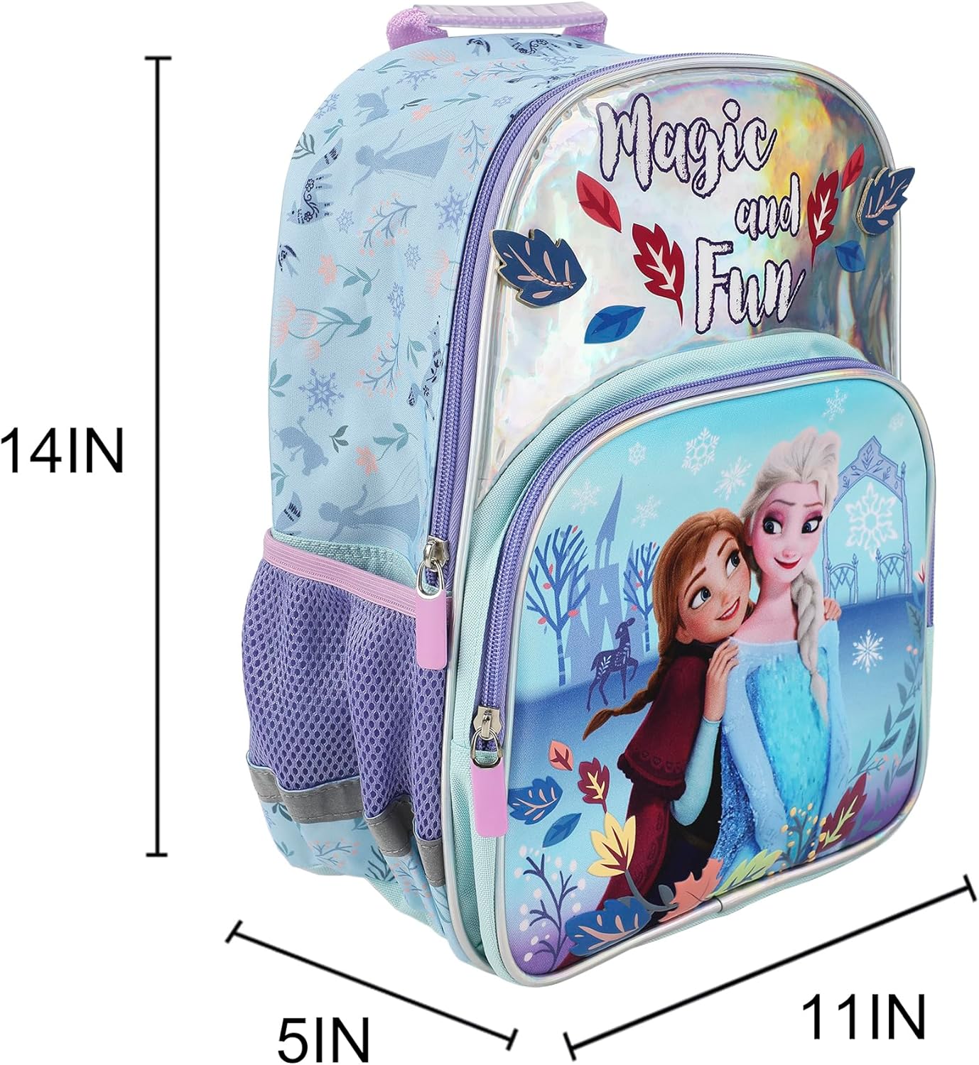 This officially licensed Disney's Frozen backpack is the perfect school, work, or travel accessory for your little princess! The backpack has been custom-designed with a bright, colorful graphic of Anna and Elsa alongside the words "Magic and Fun." With dimensions of 16"h x 12"w x 5"d, it's ideal for carrying school supplies, clothing, or sports gear. The top zipper ensures easy access to the spacious main compartment, while the large zippered front pocket keeps smaller valuables within easy reach. The padded air mesh shoulder straps are adjustable and offer a comfortable fit - even for kids who are still growing. For easy maintenance, simply wipe the backpack clean with a damp cloth.