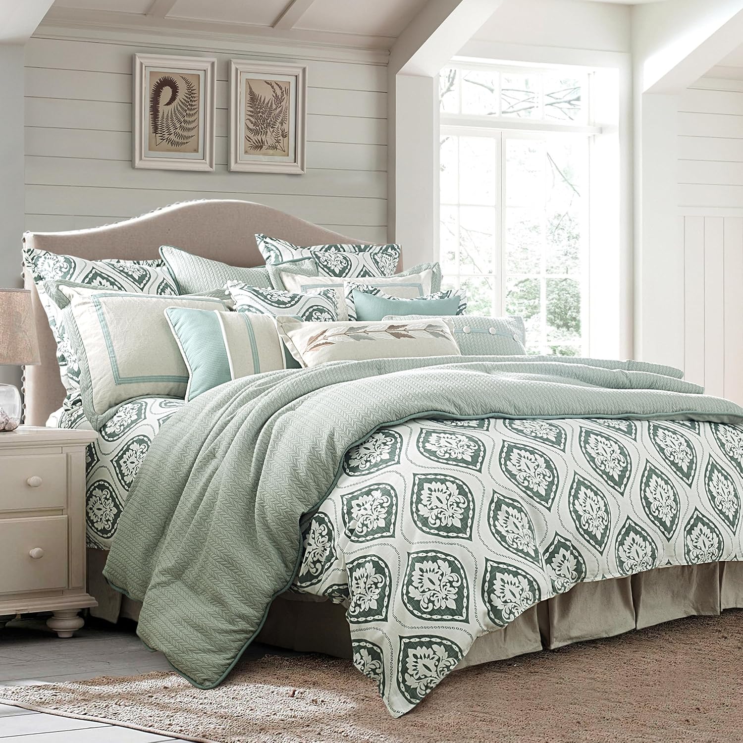 Belmont's clean, crisp, spa-inspired color palette creates a relaxing and restful ambiance for any bedroom. The bedding ensemble is perfect for those who view the bedroom as an in-home getaway. What's Included1 Comforter 1 Bed Skirt 2 Pillow Shams MaterialsComforter - Face: 100% polyester;Â Back: 100% cotton;Â Filling: 100% polyester Bed Skirt - 55% cotton/45% polyester Pillow Shams: 55% cotton/45% polyester CareDry clean recommended