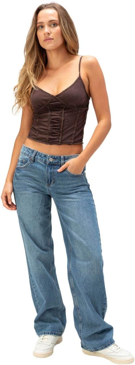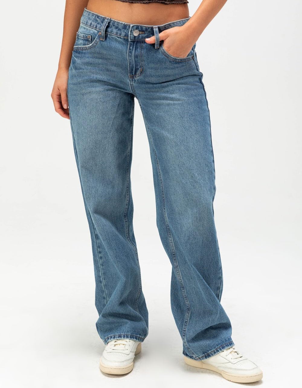 RSQ Low Rise Loose Straight Jeans. Low rise with a loose fit and straight leg. Zip fly and button closure. Belt loop waist. Traditional 5-pocket styling. Slight fraying at pockets and leg openings. Approx. inseam: 31''. 100% Cotton. Machine wash. Imported. Model is wearing a size 26. Model measurements:Height: 5'9" Bust: 32"Waist: 25"Hips: 35" | RSQ Womens Low Rise Loose Straight Jeans