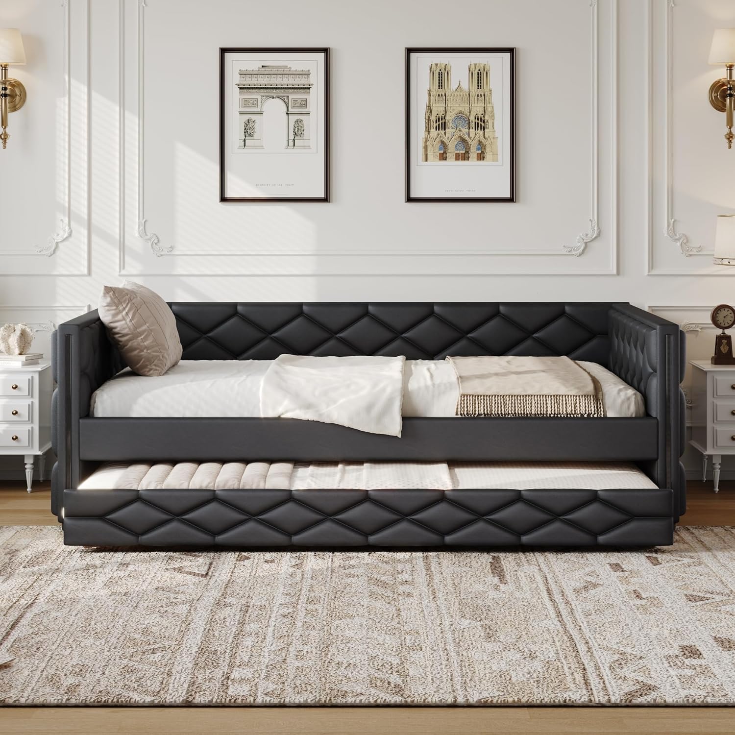 ๐The daybed is perfect for a multi-functional room or any guest space that requires some flexibility. This bed is perfect for youth, teens or adults. It works well where you need some space most of the time but also need flexibility for guests. The bed can remain extended if preferred. The trundle can be pulled out and in with the wheels and hydraulic system. Comes with slats kit so box spring is not required. โ โ โ Weight & Dimensions Overall Product Dimension: 81.9"L x 81.5"W x 33.1"H Number of Package: 2 Overall Product Weight: 116.99LBS Weight Capacity Bed:330lbs Trundle:330lbs Recommended Mattress Thickness Bed:6 inch Trundle:5 inch โ โ โ Specifications Product Type: Daybed Size: Twin Color: Beige/Gray/Pink Material: Upholstered+ Plywood Box Spring Required: No Number of Slats: 12+12 Assembly Required: Yes Country of Origin: Vietnam โ โ โ Notes: 1. Manual measurement has been used,there may be some reasonable error. 2. All the pictures are taken by actual samples, slight chromatic aberration may occur due to lighting or display.